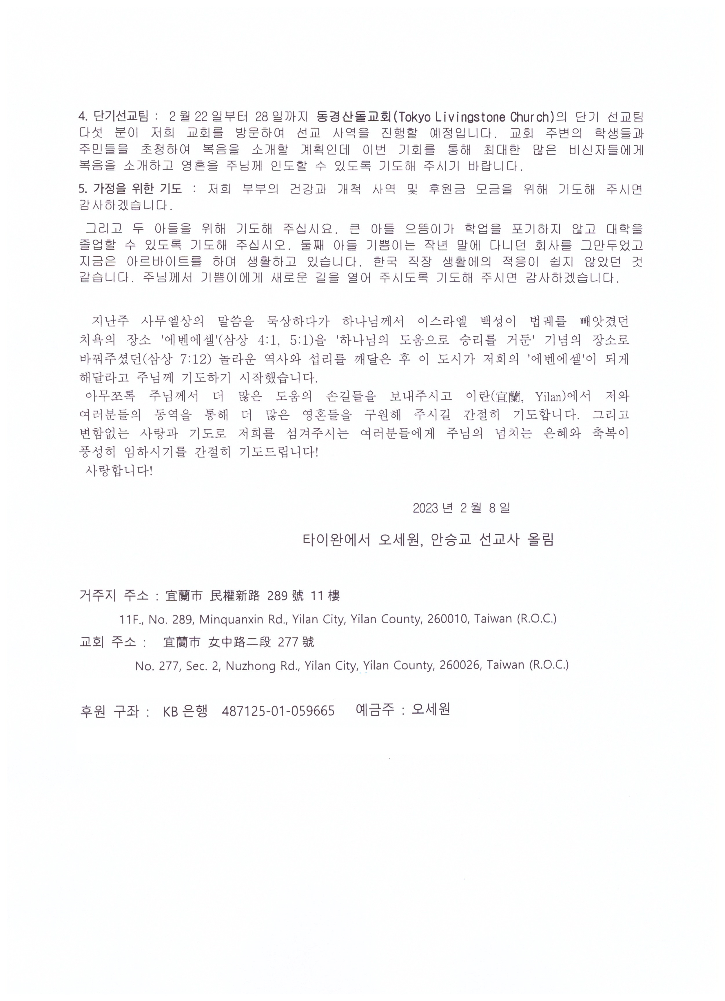 대만에서 온 선교 소식(2) 23-02-08